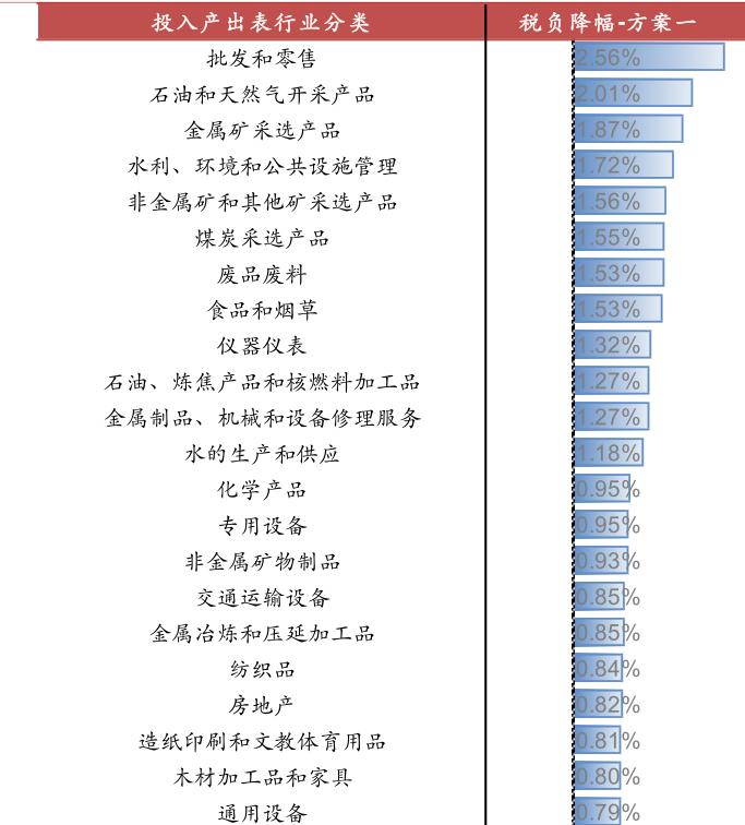 1)利用全国数据来对行业数据进行测度,预计此次减税给行业带来的利润增厚平均值在3%左右。石油石化、电力环保、商贸零售、国防军工的利润增加幅度较大,利润增长幅度均值约为3%,中位数约为2.9%。