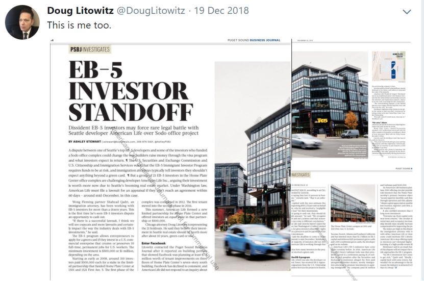 此外,这次诉讼在美国也引发了对联邦政府EB-5签证计划的争议。批评者表示,由于投资者很多语言不通,并且不了解美国的法律制度,使得他们很容易受到欺诈行为的攻击。 2017年,一名芝加哥开发商就承认他在奥黑尔国际机场附近一个价值912万美元的酒店项目中欺骗中国投资者,最终被判三年有期徒刑。