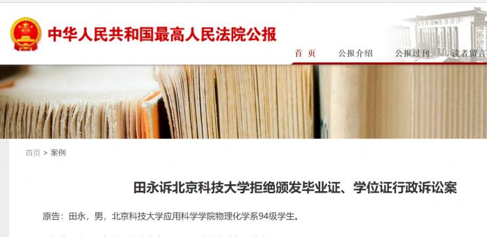 【案情回放】北京科技大学以学生田永存考试作弊为由,对其作出退学处理决定,但后续未给田永办理退学手续,田永继续以该校大学生的身份完成了其他学业任务。在毕业时,被告有关部门以田永已按退学处理、不具备北京科技大学学籍为由,拒绝为其颁发毕业证书,田永遂向北京市海淀区人民法院提起行政诉讼。经过两审,法院判决北京科技大学向田永颁发毕业证、学位评定委员会对田永的学士学位资格进行审核。