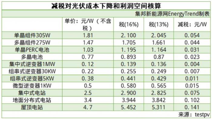 如果这一轮降价传导顺利,将对下游环节价格产生影响。根据testpv和EnergyTrend研究,通过减税,能为光伏产品带来的实际成本下降和利润空间计算如下: