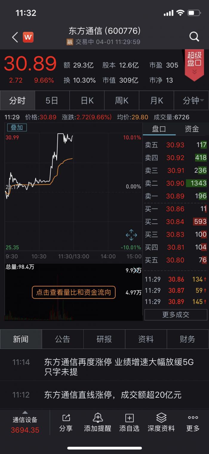 近期,东方通信股价处于调整状态。3月29日,东方通信报收28.17元,较41.88元的盘中最高价下跌了48%。4月1日,东方通信低开高走,午间收盘报30.89元,涨幅9.66%。