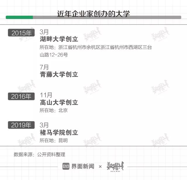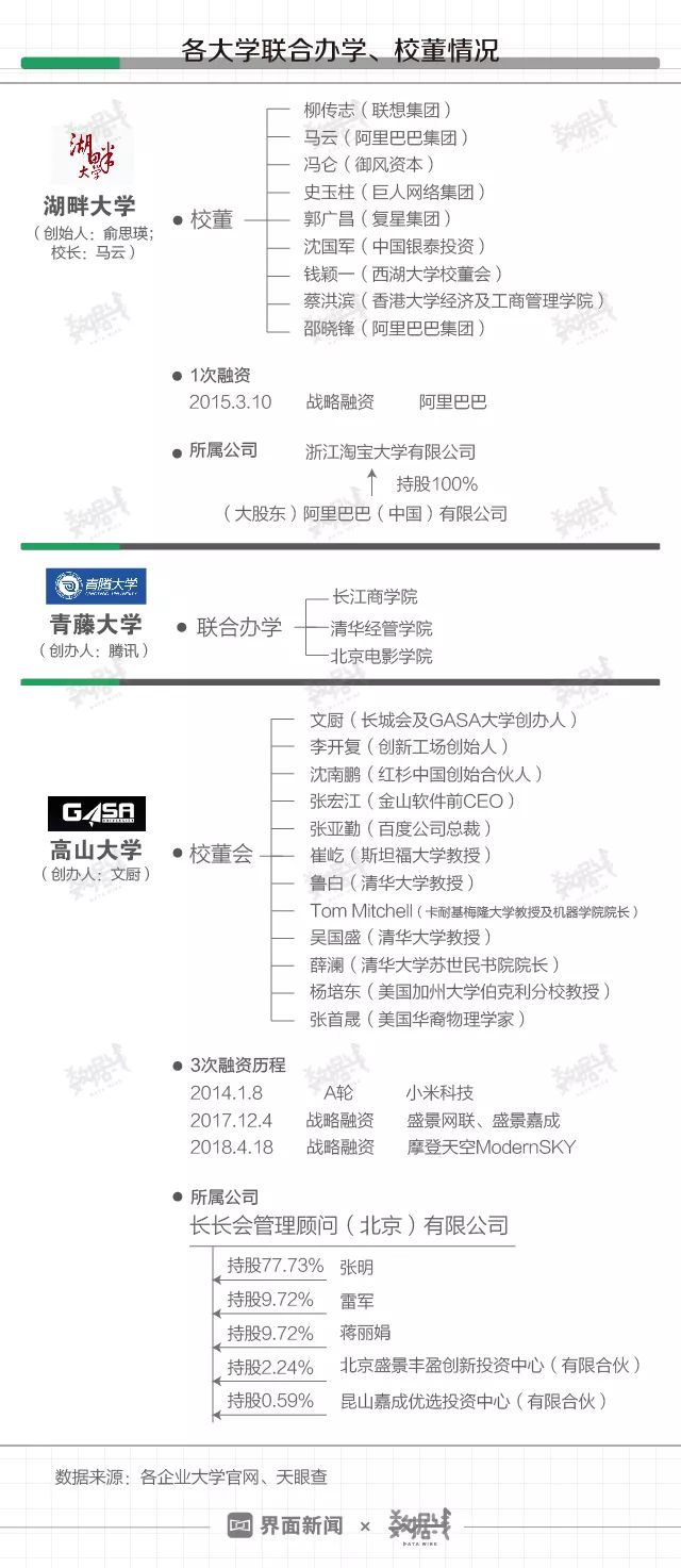 近年混迹商圈的企业家们开始经营起了“大学”项目。既有阿里巴巴系湖畔大学(2015年3月)、腾讯系青藤大学(2015年7月)、获小米融资的高山大学(2016年11月)相继创办成立,也有近日由王石、吴晓波出任名誉院长的褚马学院创办成立。 同时,求学热也在蔓延,既有2018年OFO创始人戴威入选高山大学,也有近日纽班文化董事长胡彦斌入学湖畔大学。企业家办大学,谁在背后出资?谁又在贡献学费?