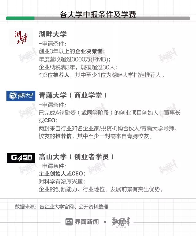 同时,除高山大学外,湖畔大学和青藤大学均设有推荐制。申请湖畔大学需要3位推荐人,且至少1位为湖畔大学指定推荐人。申请青藤大学需要准备两封推荐信,其中至少一封来自青藤校友。因此交得起学费,并不意味着获得申请资格。