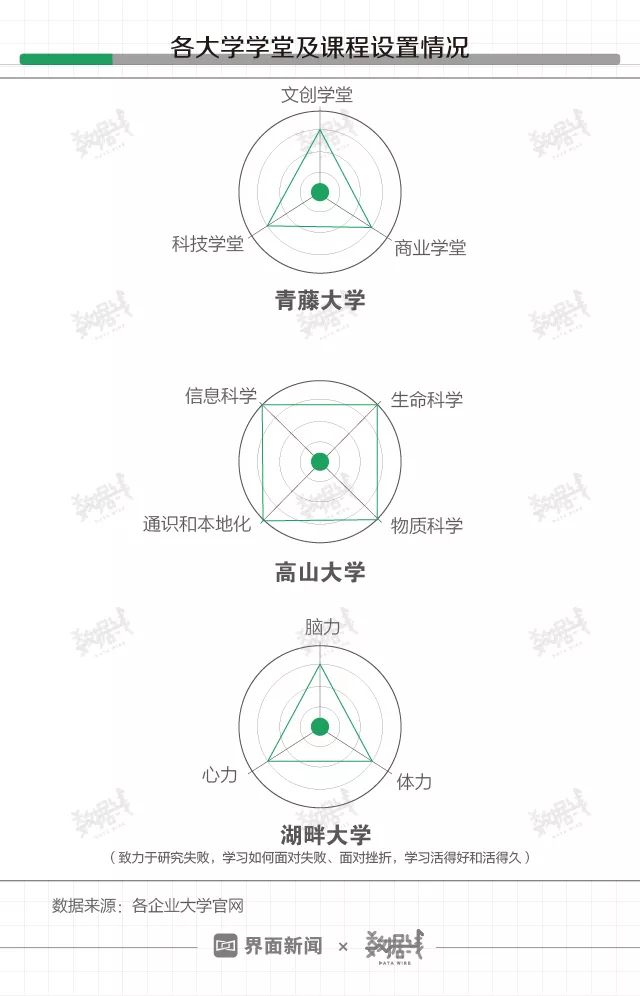 据青藤、高山、湖畔3家大学官网,青藤大学下设商业学堂、科技学堂、文创学堂,具体课程因学堂制宜。 高山大学共划分信息科学等5个模块。湖畔大学的课程设置最直白:心力课程、脑力课程和体力课程。