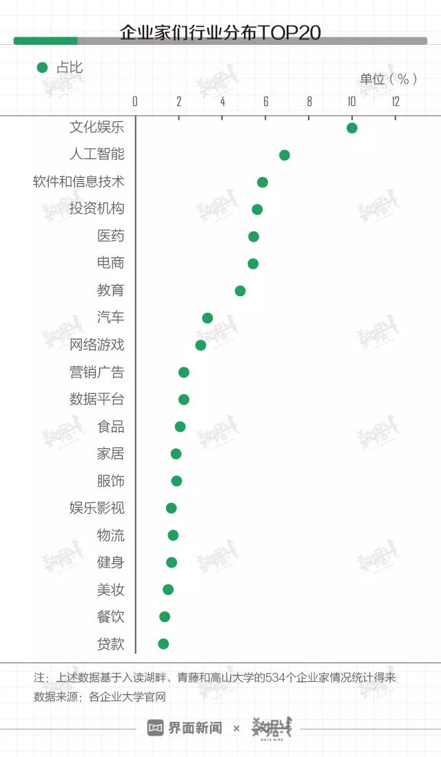 虽然申请条件严苛,但企业家依然争相入学。据湖畔、青藤和高山大学官网,截至2019年3月28日,共计有563位企业家成功入学。 界面数据(公众号ID:shujuxian_kuaikan)统计了其中534名企业家(有详细说明)的行业情况后发现,超十分之一的企业家来自文化娱乐行业,其次是人工智能行业。