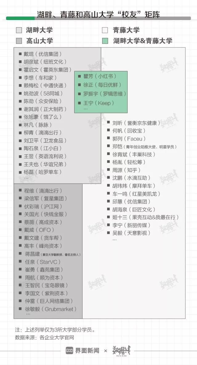 随着求学企业高管日渐增多,各家“校友”版图也在日渐扩张,学校间的关系网日渐复杂且存在交叉。 据界面数据(公众号ID:shujuxian_kuaikan)不完全统计,小红书瞿芳、每日优鲜徐正、逻辑思维罗振宇和Keep王宁等商界名人最爱“上学”,他们既游走于湖畔大学,也兼具“青藤”背景。