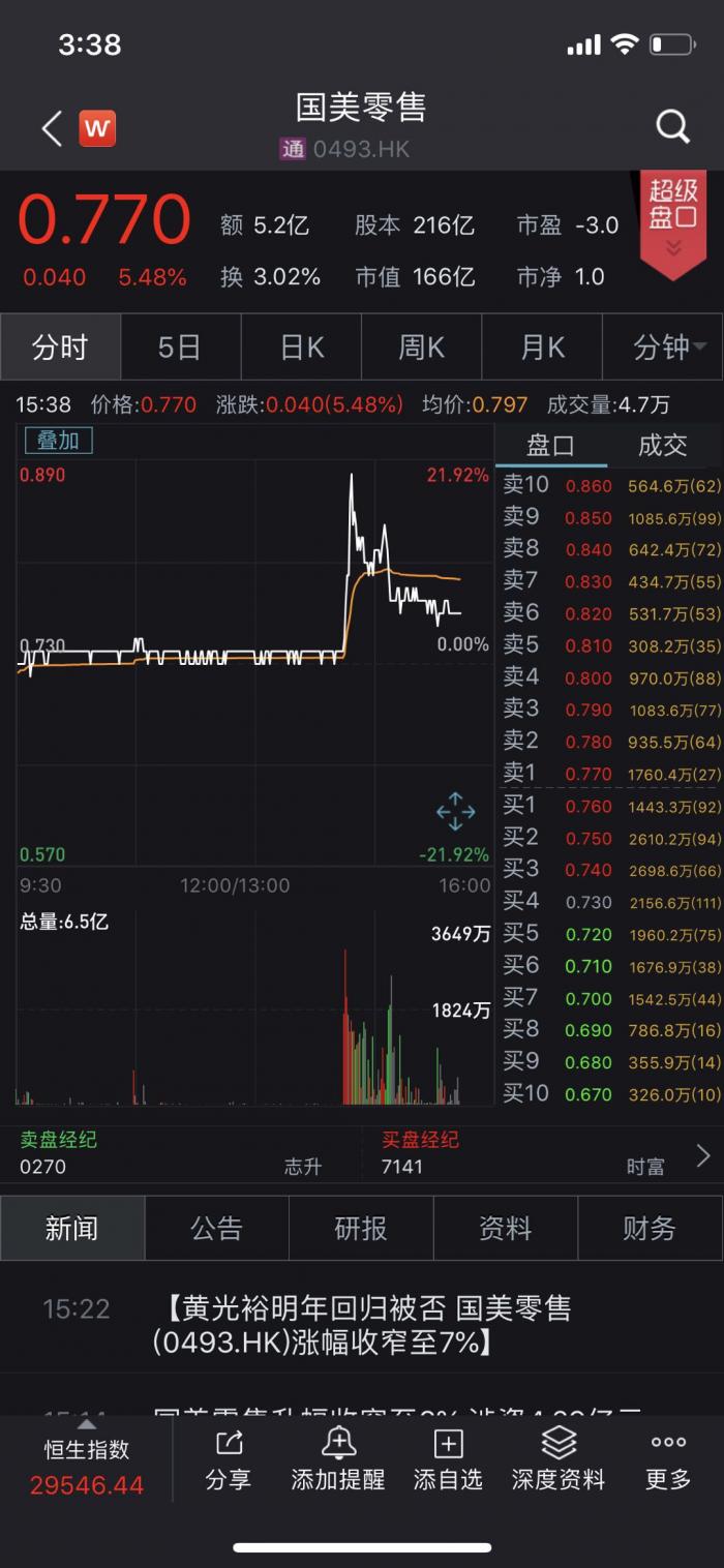午后,国美零售(0493.HK)一度拉升至20.55%,国美金融科技(0628.HK)拉升至20%。澄清后,两只个股涨幅迅速收窄,涨幅分别为5.48%和10.77%,报收0.77港元和0.72港元。