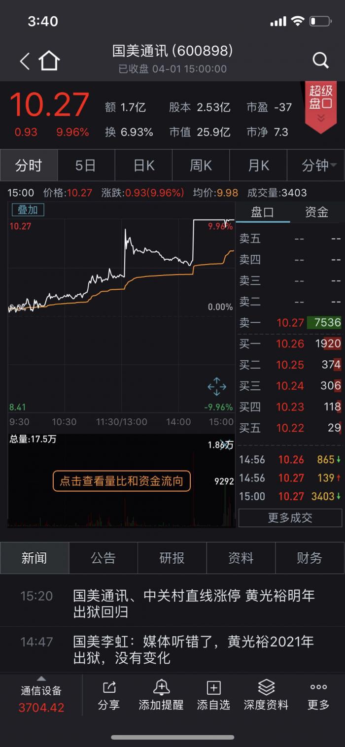 A股方面,国美通讯(600898.SH)直线封板,受澄清消息影响打开涨停板,略微收窄至9.21%,但之后又迅速冲击涨停,报10.27元。