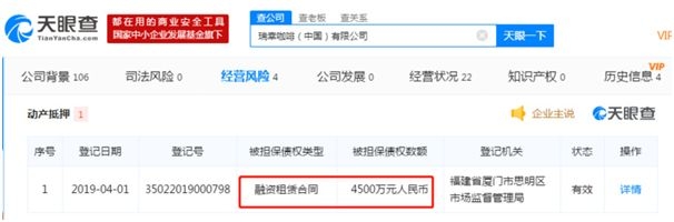抵押权人为中关村科技租赁有限公司,被担保债权数额为4500万元。瑞幸的动产抵押物均为咖啡机、奶箱、粉仓,物品所属地遍及北京、上海、广州、深圳、成都等多地门店。