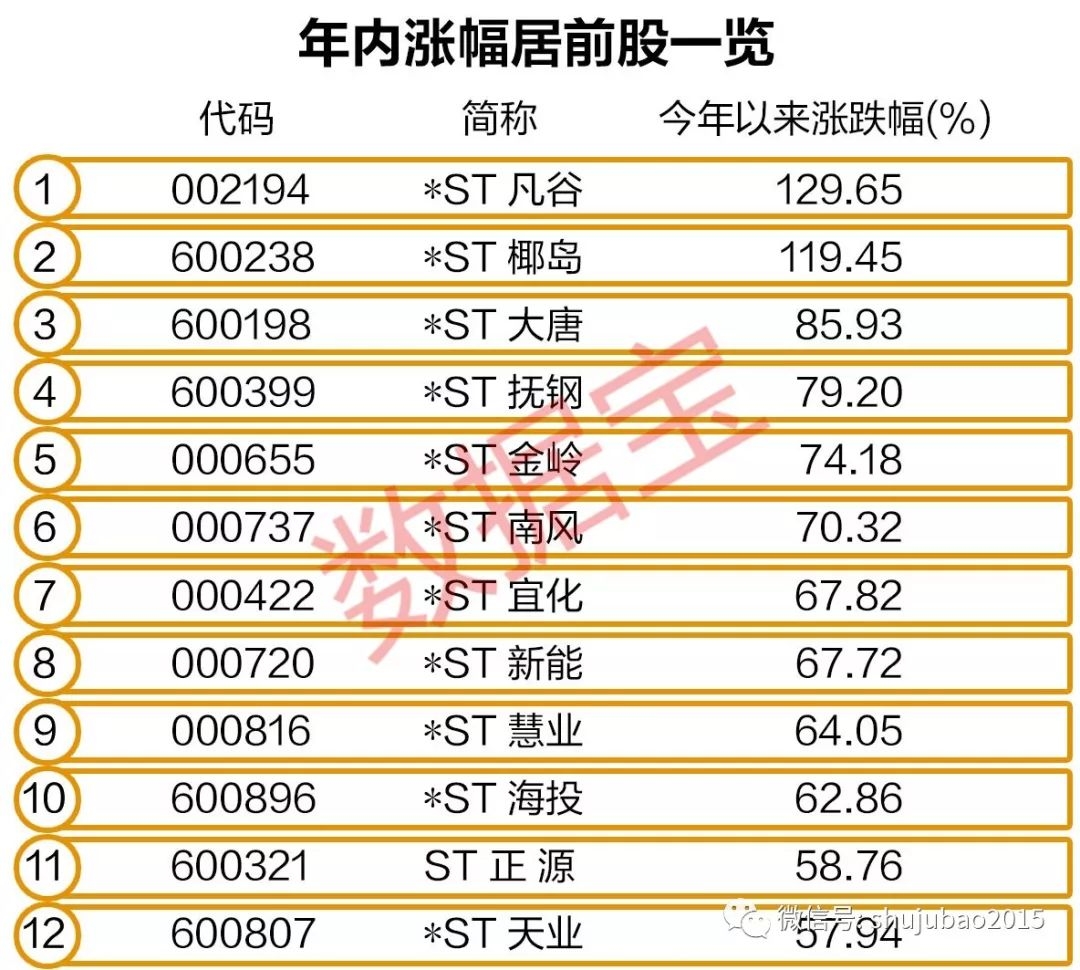 累计涨幅较大的还有*ST大唐、*ST抚钢、*ST金岭、*ST南风等。8只个股没能跑赢同期沪指,包括ST创兴、ST宏盛、*ST罗顿、*ST狮头等,其中*ST厦华、*ST地矿、ST景谷今年以来涨幅均不足10%。