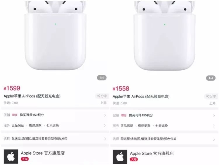刚刚推出的新品 AirPods 配无线充电盒版本也出现了价格下调,降价前的价格是1599元,降价之后为1558元。
