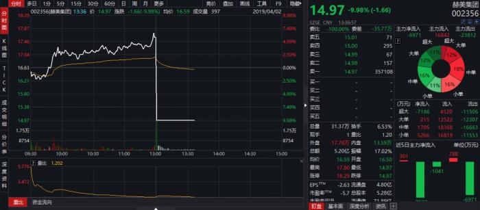 4月2日午间开盘,赫美集团(002356.SZ)股价“闪崩”跌停,截至发稿下跌9.98%,报收14.97元/股。