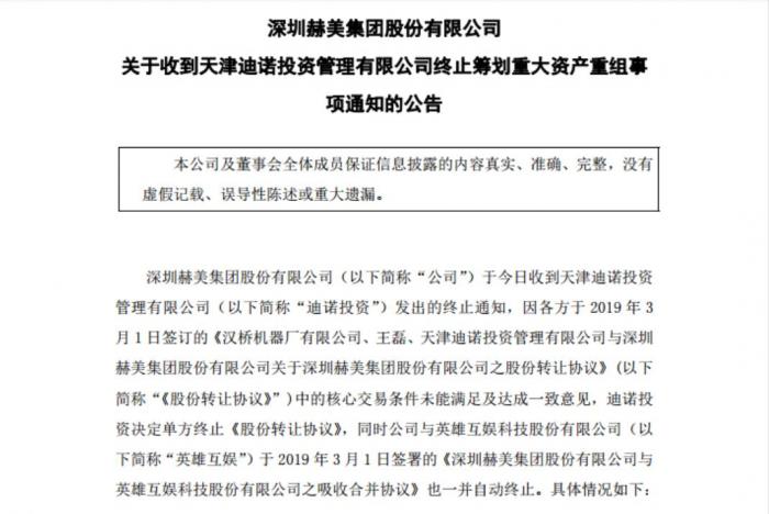 当日午间,赫美集团发布公告称,公司当日收到天津迪诺投资管理有限公司(下称“迪诺投资”)发出的终止通知,因各方于2019年3月1日签订的《股份转让协议》中的核心交易条件未能满足及达成一致意见,迪诺投资决定单方终止《股份转让协议》,同时公司与英雄互娱于2019年3月1日签署的《深圳赫美集团股份有限公司与英雄互娱科技股份有限公司之吸收合并协议》也一并自动终止。