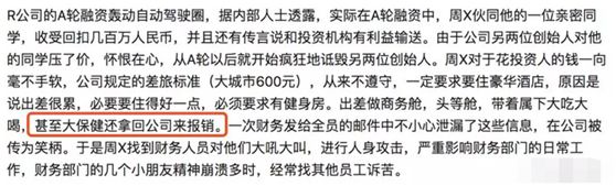 基金君扒了一下采访中的匿名帖,该贴中详细列举了周光6大罪状,不仅称其出差做商务舱,头等舱,带着下属大吃大喝, 甚至还具体至“报销大保健”等细节。