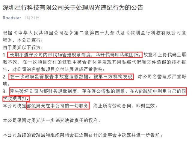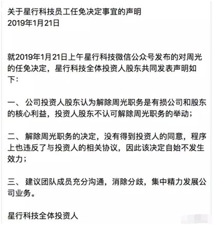 不久,一封署名RoadStar全体投资人的资本方也发了声明,声明表示,解除周光职务的决定有损公司和股东的核心利益,并且程序上也违反了与投资人的相关协议,并不生效。