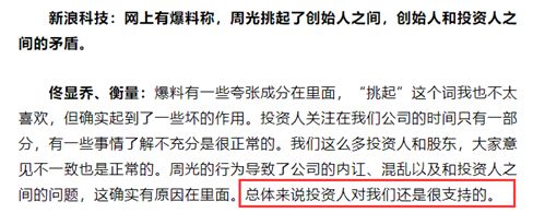 然而就在两天前的新浪科技的采访中,创始人佟显乔、衡量还表示投资者人对公司开除周光的行为很支持。