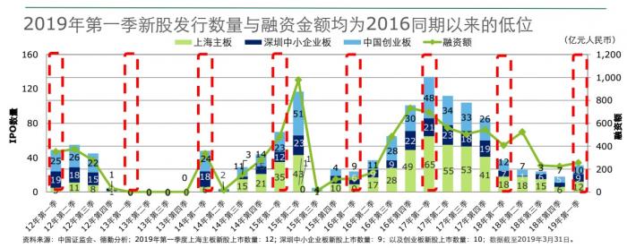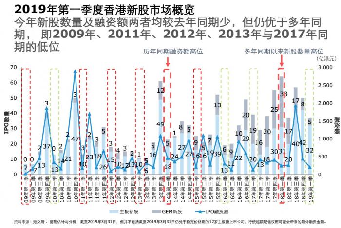 2019年一季度,香港资本市场新股数量和融资额均大幅降低,总计有37只新股上市,募资204亿港元,与2018年第一季度比较,新股数量由当时的64只下跌42%,集资金额则由244亿港元减少16%。虽然少于去年同期,但仍多于2009年、 2011年、 2012年、 2013年与2017年同期水平。