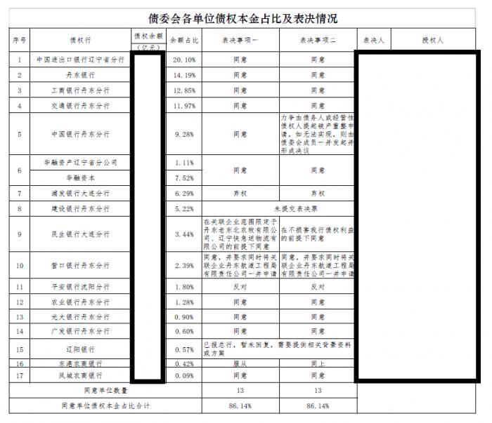 其中投“同意”票的债委会成员机构,包括中国进出口银行辽宁省分行、丹东银行、工商银行丹东分行、交通银行丹东分行、中国银行丹东分行、华融资产辽宁省分公司及华融资本、民生银行大连分行、营口银行丹东分行、农业银行丹东分行、光大银行丹东分行、广发银行丹东分行、东港农商行、凤城农商行,以上银行所持有的债权份额占总份额的86.14%。