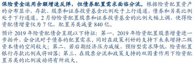华创证券认为,2019年保险资金会加大权益类资产配置,分流对债市的配置。