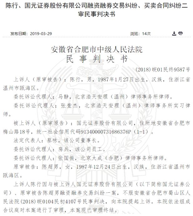 在2月26日陈某账户被强制平仓之后,陈某尚欠国元证券本金1007.17万元、利息10.85万元以及罚息29.21万元。为此,国元证券提起诉讼并获得一审胜诉。陈某不服一审判决,向合肥市中院提起上诉。