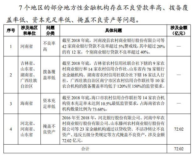 其中提到,仍有7个地区的部分地方性金融机构存在不良贷款率高、拨备覆盖率低、资本充足率低、掩盖不良资产等问题。