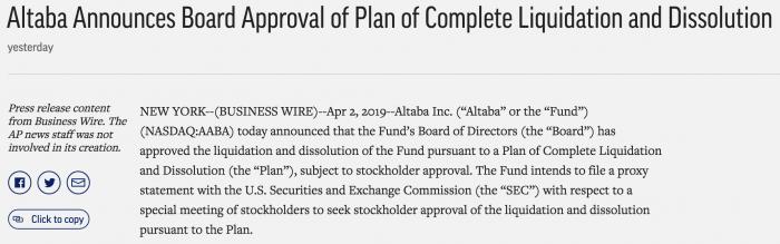 当地时间4月2日,阿里巴巴大股东Altaba基金董事会发布公告,称批准全面清算和解散计划,在获得股东批准进行清算和解散之前,该基金拟出售不超过其所持阿里巴巴股份的50%,在股东批准后计划售出剩余股份。