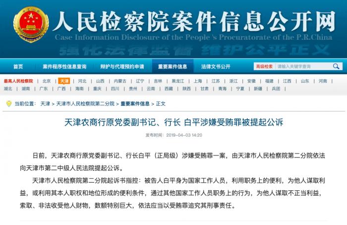 4月3日,人民检察院案件信息公开网公示,日前,天津农商行原党委副书记、行长白平(正局级)涉嫌受贿罪一案,由天津市人民检察院第二分院依法向天津市第二中级人民法院提起公诉。
