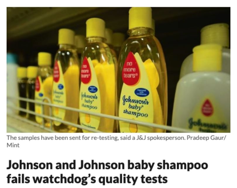 拉贾斯坦邦药品监督管理局3月5日发出的通知中称,因为其中含有“有害成分”,该局从两批强生婴儿洗发水中提取的样品未能通过质量检测,但声明并未详细说明。目前印度药品监督管理机构已将强生婴儿洗发水的部分样品贴上“质量不达标”的标签。此外,印度药品管制组织要求印度各地的药品管制人员从市场上撤回强生婴儿洗发水,以确保不再让消费者使用。