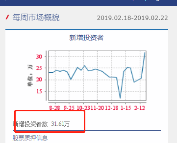 根据中国结算的最新数据,截至2019年2月22日当周新增投资者数31.61万,前值为20.66万,环比大涨53%。为2018年3月30日当周以来,首次单周开户数超过30万。