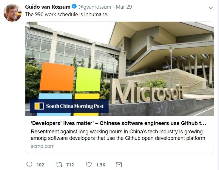 连Python(世界最流行的编程语言之一)之父都在Twitter上发表意见:996模式惨无人道!
