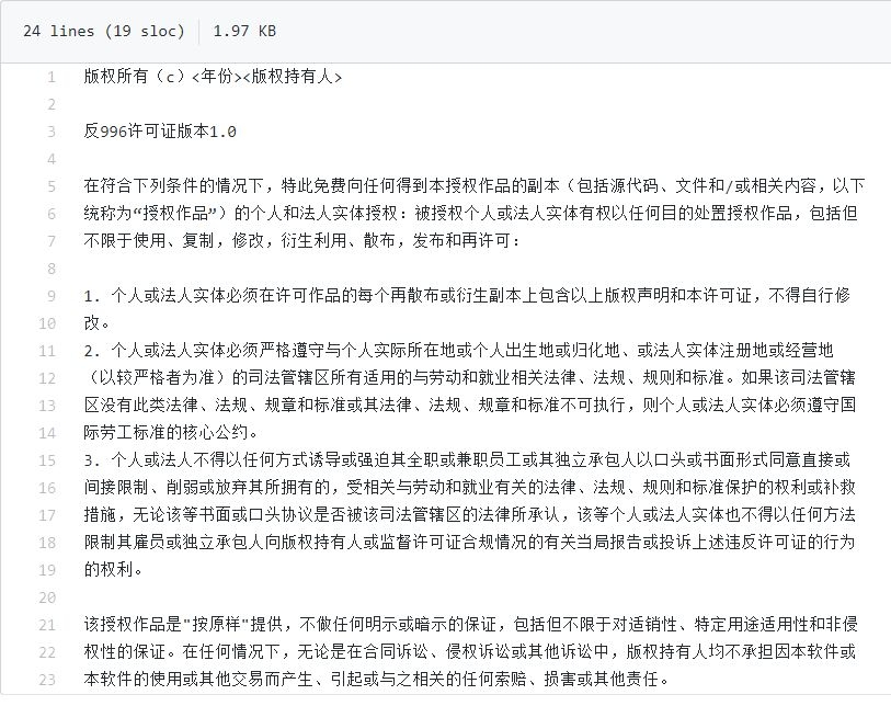此外,该项目还做了一件非常有程序员风格的事情——呼吁程序员在自己的开源代码中加入证书,禁止996相关企业使用带996.ICU证书的开源代码。