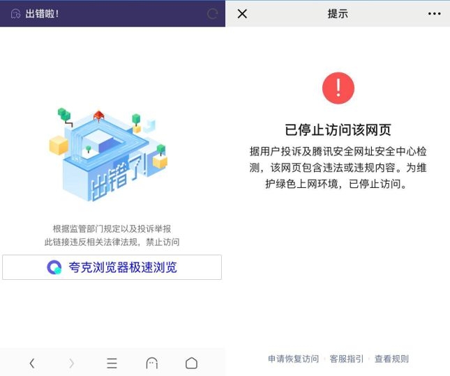 每经小编测试发现,可以证实的是,百度、搜狗、Chrome、火狐等浏览器没有屏蔽,而UC、微信则以不同姿势拒绝人们访问相关网址。