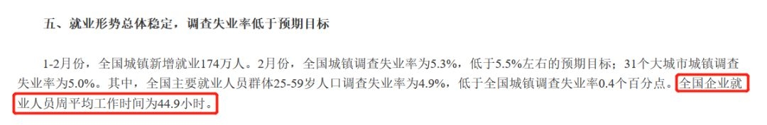 据国家统计局今年3月发布的数据显示,1-2月,全国企业就业人员周平均工作时间为44.9小时。