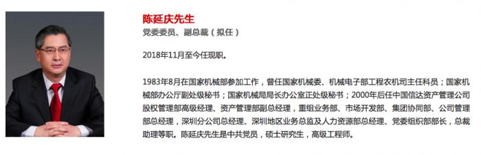 据了解,陈延庆此前在信达任职长达18年,历任股权管理部高级经理、资