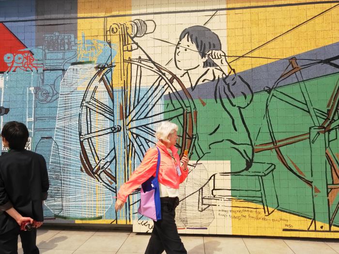 (CHAT六厂内的墙壁上复原了纺织厂工作场景,记者摄)