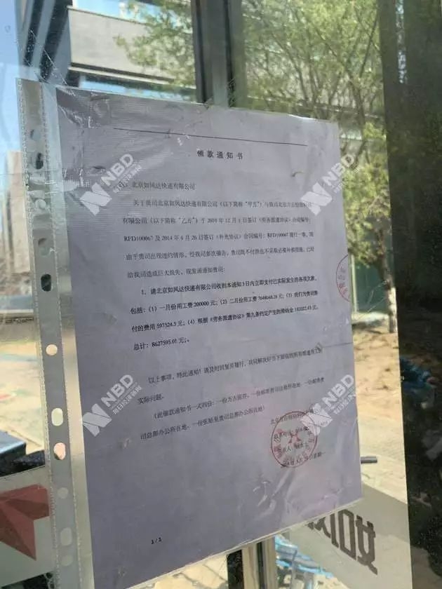 张贴在大门口的北京万古恒信科技有限公司(劳务派遣公司)的《催款通知书》显示,如风达既不付款也不采取必要补救措施,已经给公司造成巨大损失,并通知如风达立即支付包括: