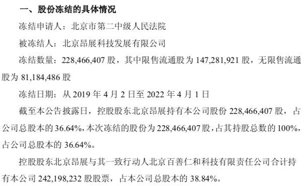 根据该方案,公司需将持有的全资子公司深圳市兴飞科技70.00%的股权,以及持有的全资子公司中科融通物联科技无锡有限公司51.00%的股权,就履行提前赎回相应债券事宜提供质押担保。因公司未能及时办理完成深圳市兴飞科技70.00%股权、中科融通物联科技无锡有限公司51.00%股权的质押登记手续,太平洋证券起诉公司及担保方北京昂展,因此冻结了北京昂展持有的本公司全部股权。