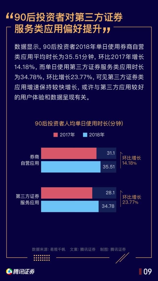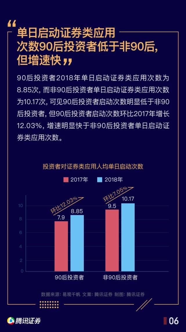 1、90后投资者2018年单日启动证券类应用次数为8.85次,而非90后投资者单日启动证券类应用次数为10.17次,可见90后投资者启动次数明显低于非90后投资者,但90后投资者启动次数环比2017年增长12.03%,增速明显快于非90后投资者单日启动证券类应用次数。