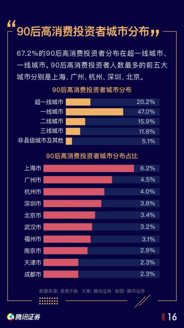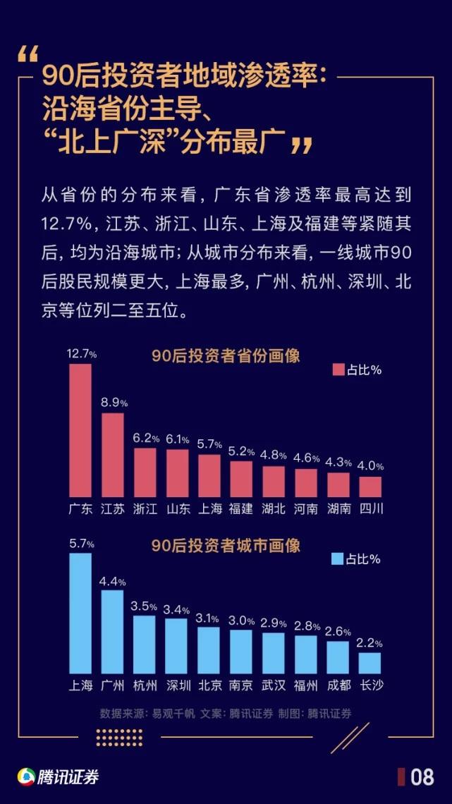 2、从省份的分布来看,广东省渗透率最高达到12.7%,江苏、浙江、山东、上海及福建等紧随其后,均为沿海城市;从城市分布来看,一线城市90后股民规模更大,上海最多,广州、杭州、深圳、北京等位列二至五位。
