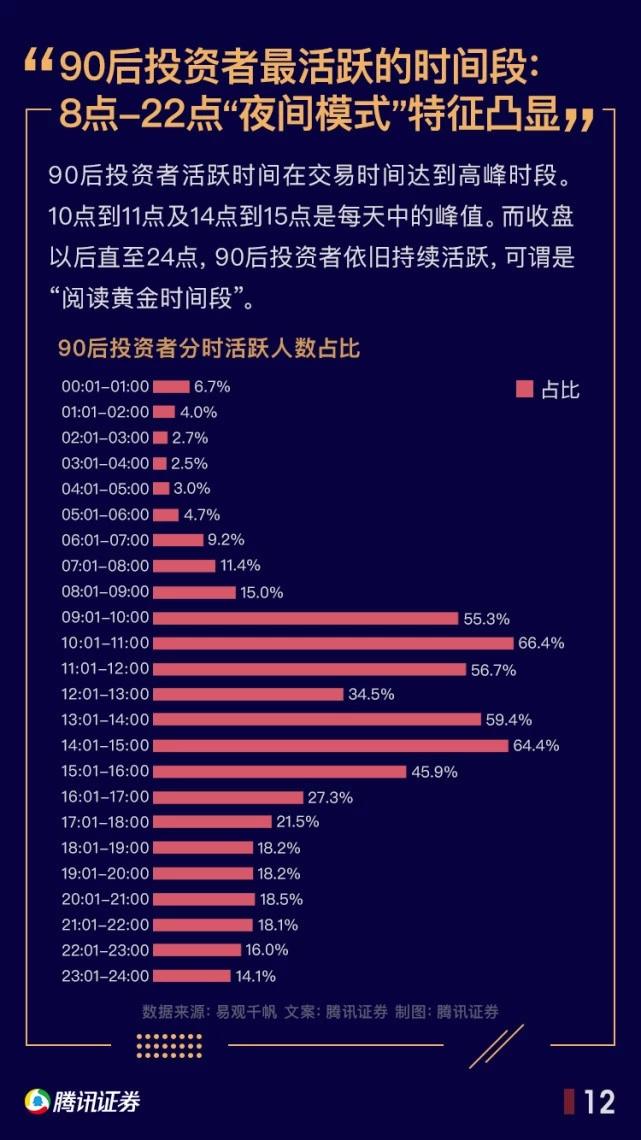 3、90后投资者活跃时间在交易时间达到高峰时段。10点到11点及14点到15点是每天中的峰值。而收盘以后直至24点,90后投资者依旧持续活跃,可谓是"阅读黄金时间段"。
