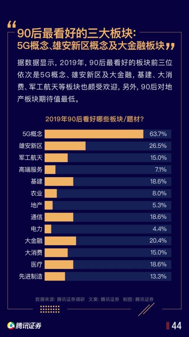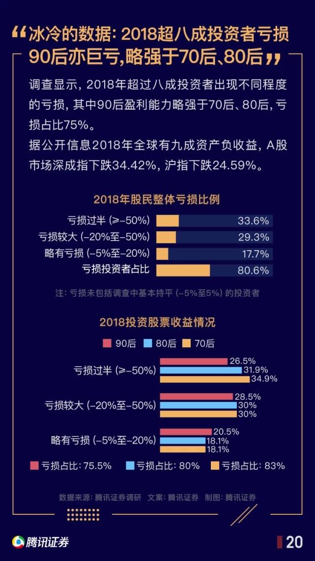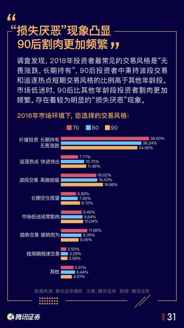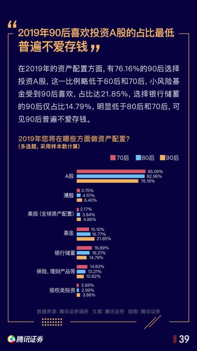 4、调查显示,2018年超8成的90后在资产配置中选择A股,比例略低于70后和80后;90后涉猎更广泛,在债券、期货、储蓄等方面均有参与。