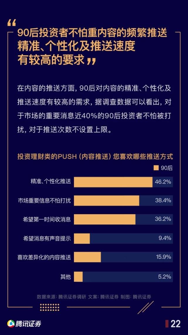 5、在内容的推送方面,90后对内容的精准、个性化及推送速度有较高的需求,据调查数据可以看出,对于市场的重要消息近40%的90后投资者不怕被打扰,对于推送次数不设置上限。