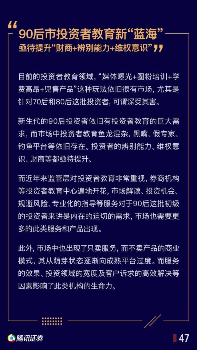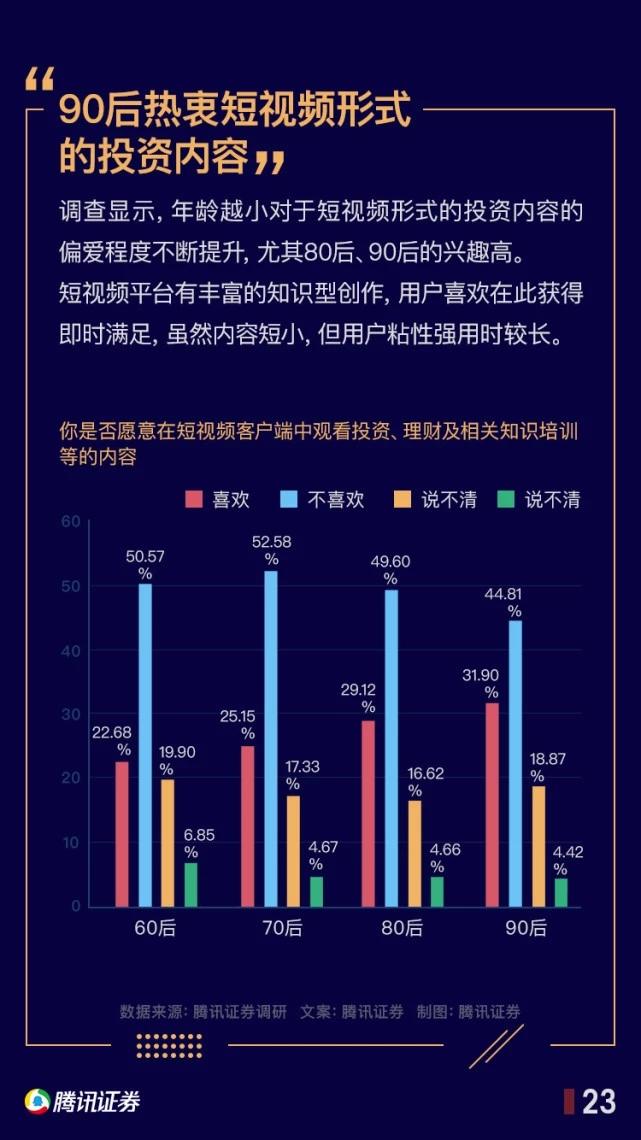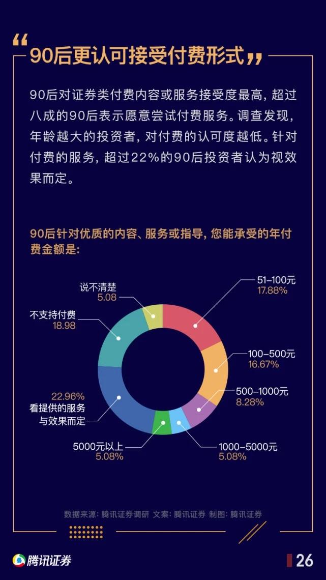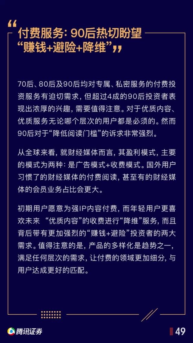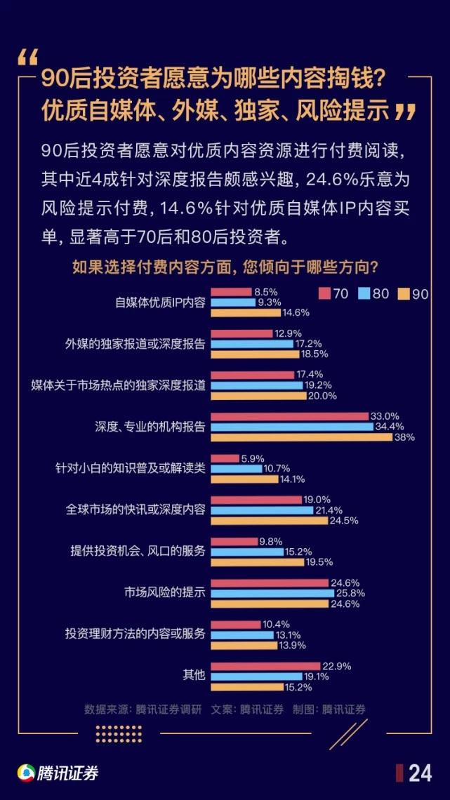 6、90后投资者愿意对优质内容资源进行付费阅读,其中近4成针对深度报告颇感兴趣,24.6%乐意为风险提示付费,14.6%针对优质自媒体IP内容买单,显著高于70后和80后投资者。