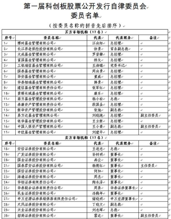 为规范科创板股票发行活动,引导市场形成良好稳定预期,依据《上海证券交易所科创板股票公开发行自律委员会工作规则》,上海证券交易所组建了第一届科创板股票公开发行自律委员会(委员及其代表名单详见附件)。