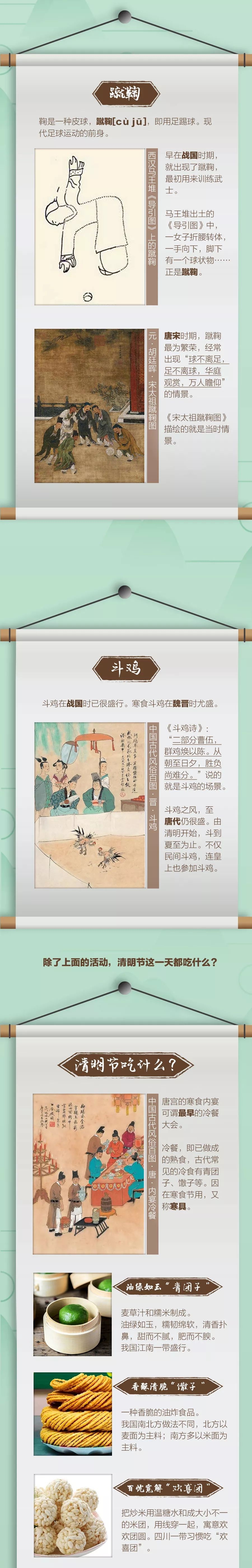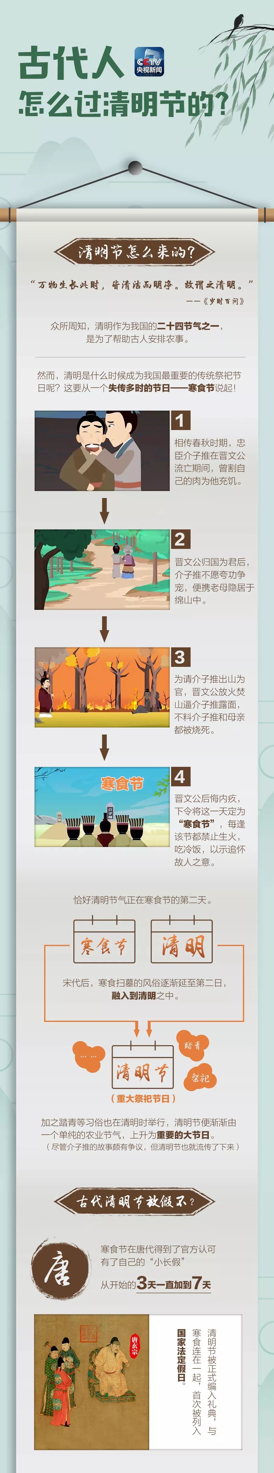 其实在古代,清明节除了有祭奠逝者的悲伤,还有万众踏青、郊游、戴柳、斗鸡等多种活动。那么,你可知道清明节是怎么来的?古人在清明节可有假期?他们是怎么过的?一图了解↓
