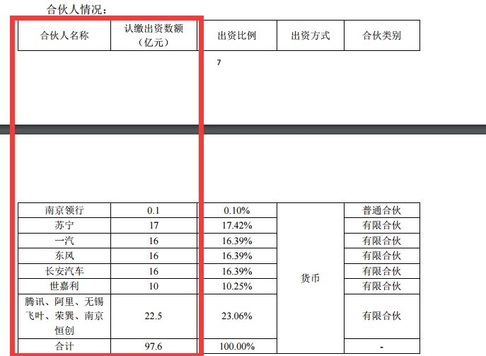 出资比例方面,公告显示,腾讯、阿里、无锡飞叶、荣巽、南京恒创共认缴出资额22.5亿元,苏宁17亿元,长安、一汽、东风各认缴出资额16亿元,世嘉利10亿元,如下图: