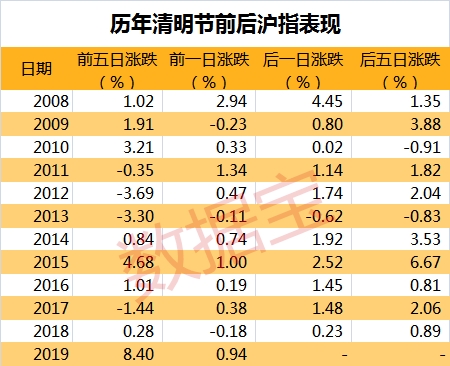市场交投活跃、股指连创新高的情况下,对于后续行情,小编虽不好说,却发现了历年清明前后市场短期走势的一个大概率事件。统计显示,2008年以来历年清明前后市场大概率走好。2008年-2018年这11年的表现中,清明节前一日有8次上涨,3次下跌,清明节后有10次上涨、1次下跌,昨日市场的走势出现了大概率的上涨,清明节后会不会依然如此呢?进一步统计,过去11年中不仅清明节后首日大概率上涨,节后五日沪指上涨的也有9次,下跌的仅2次。