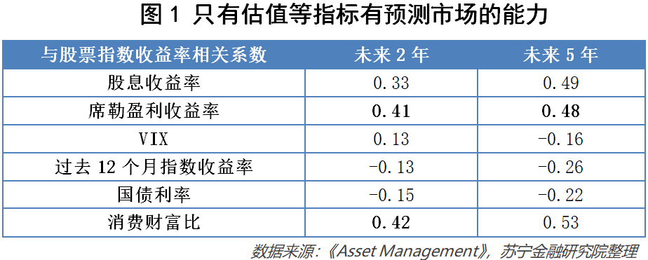 每个投资者都想买在市场底部、卖在市场高位。但数据分析表明,只有两个指标对预测股市有价值,那就是估值和消费财富比(参见表1)。