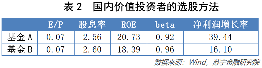 不论是基金A还是基金B,两者重仓股的盈利收益率较高,都在0.07左右,意味着这些重仓股的平均PE大约在15倍以下;股息率水平也较为接近,平均股息率都在2.6左右;盈利能力较强,平均ROE都在15%以上;重仓股近2年的beta水平都在1以下,说明这类股票风险较低(参见表2)。