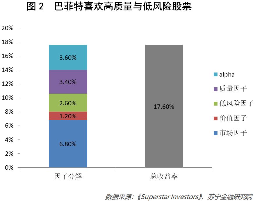 巴菲特喜欢高质量与低风险的股票。从巴菲特投资收益率的分解来看,17.6%的年化收益率中,大概有3.4%来自质量因子、2.6%来自低风险因子(参见图2)。